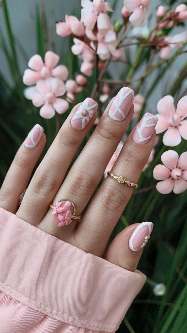 Soft blush pink nails are decorated with white abstract lines and delicate floral accents. The style feels romantic and airy, inspired by spring flowers and gentle details.
