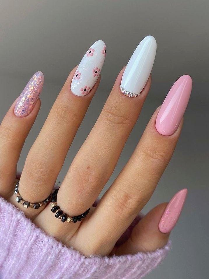 A combination of pink, white, and translucent nails with subtle florals, shimmer, and glossy finishes creates a soft spring aesthetic. The overall feel is playful, dreamy, and slightly whimsical.