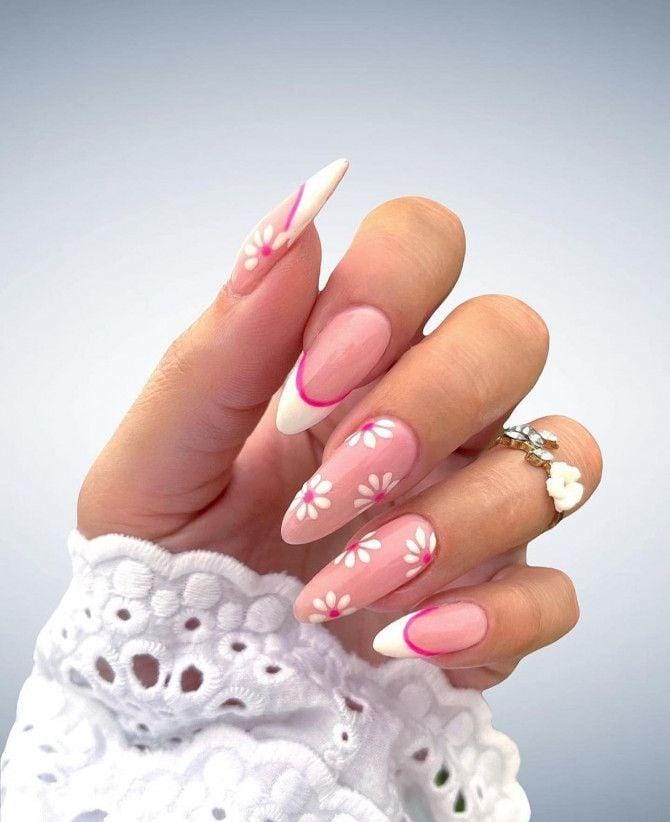 Soft pink nails are paired with crisp white French tips and scattered daisy accents for a fresh spring feel. The look is feminine, light, and effortlessly cheerful.
