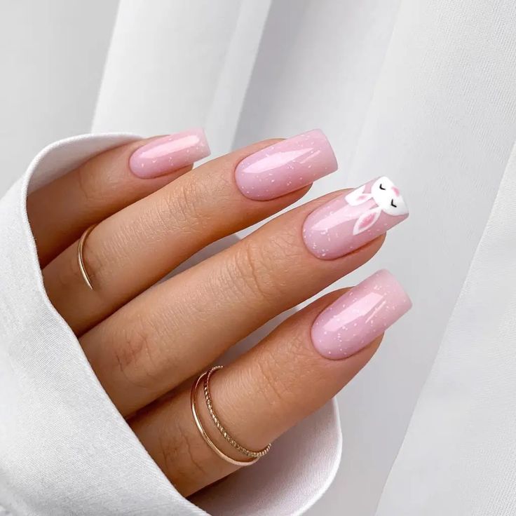 Light pink nails with a glossy finish are accented by a cute white bunny detail on one nail. The design gives off a soft, cozy, and playful spring vibe.