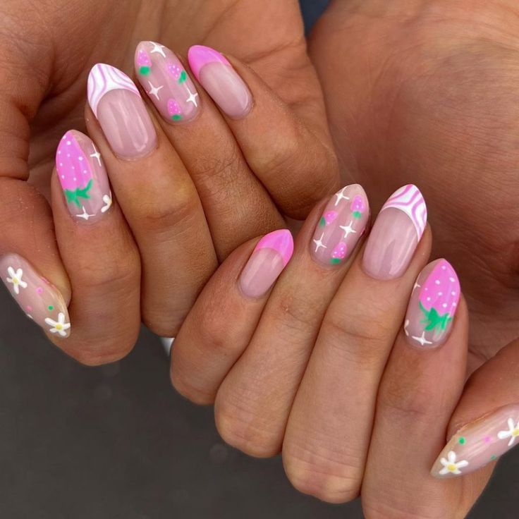 A mix of pastel pink nails, gingham patterns, and cute strawberry art creates a playful spring design. It feels sweet, fun, and inspired by sunny picnic days.