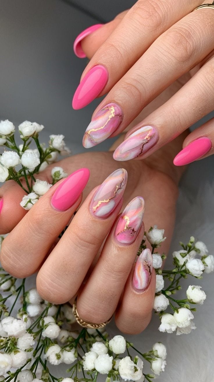 These nails feature a pink-and-white marble effect with soft gold accents for a polished finish. The look is graceful, luxurious, and ideal for spring events.