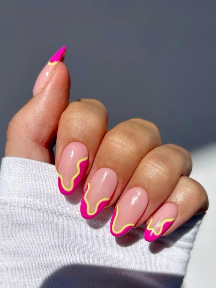 Flowy pink and yellow waves blend smoothly for a playful, melted-pastel effect. The look is youthful, glossy, and perfect for warm sunny days.