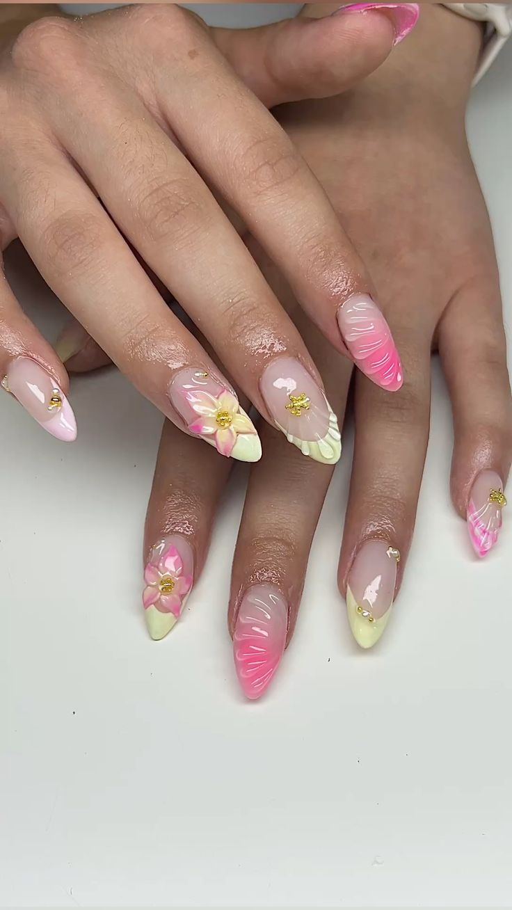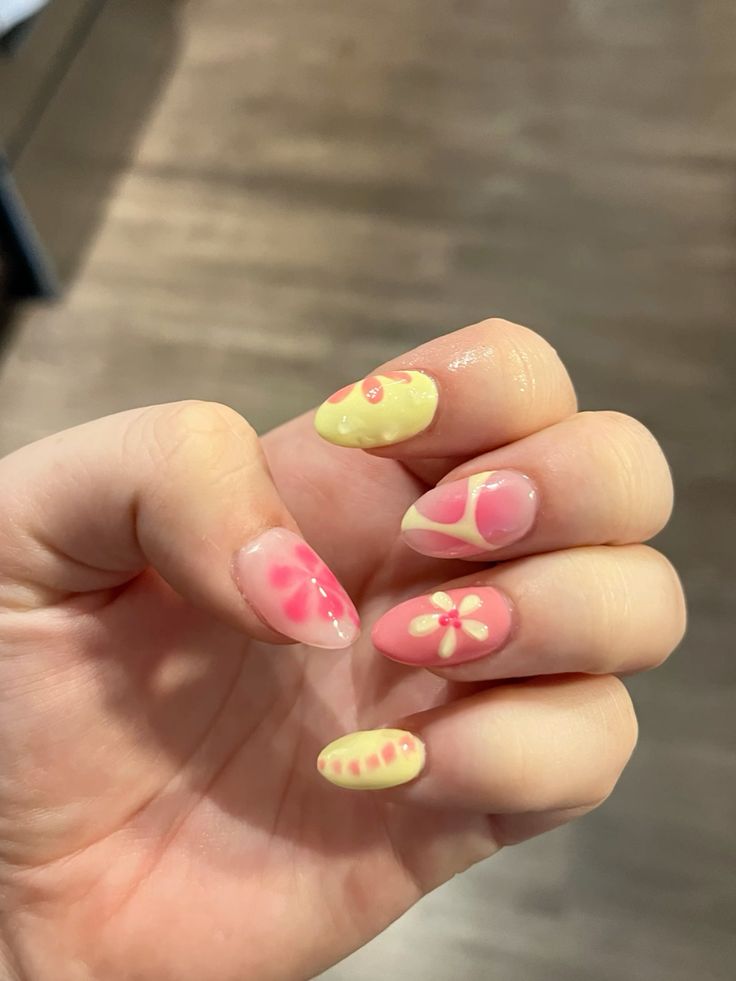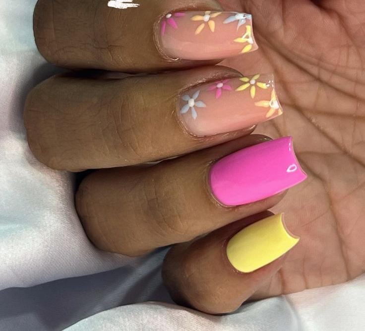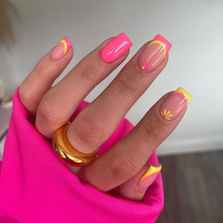 Bright pink and yellow nails are paired with abstract shapes and floral motifs for a fun, bold look. The design feels cheerful, youthful, and full of spring energy.