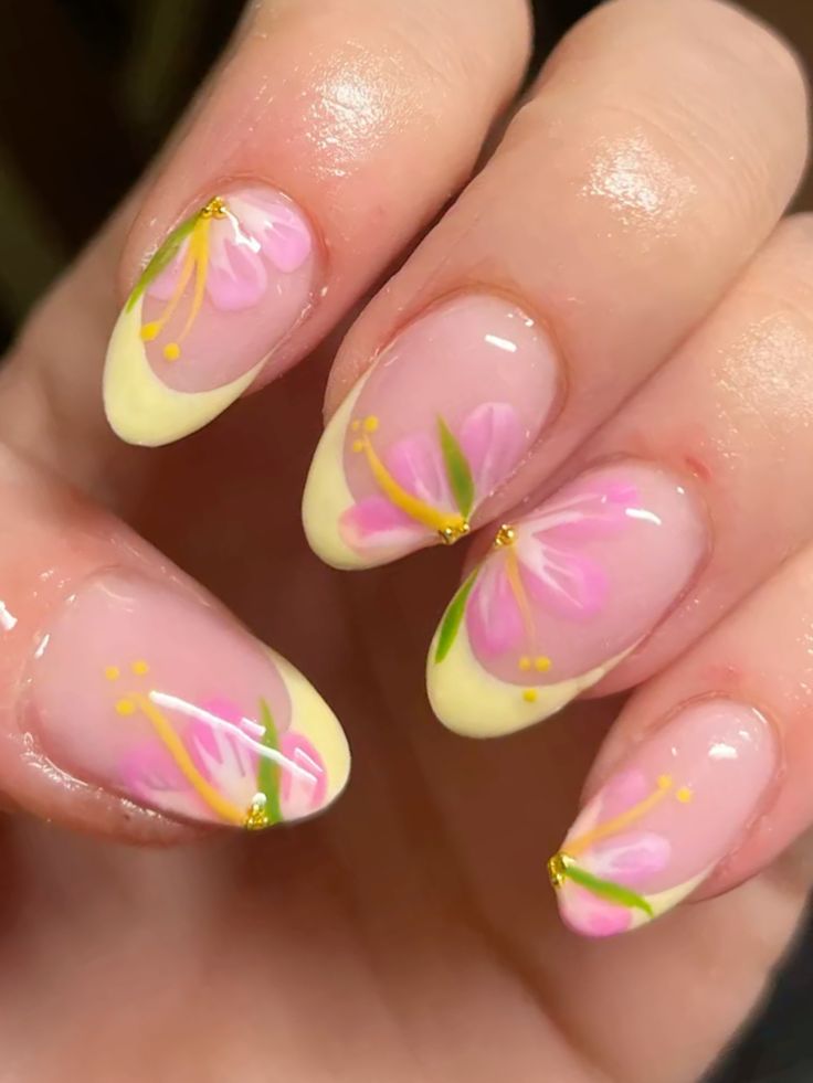 A sheer pink base is paired with buttery yellow French tips and hand-painted floral petals. The vibe is elegant, airy, and delicately romantic.