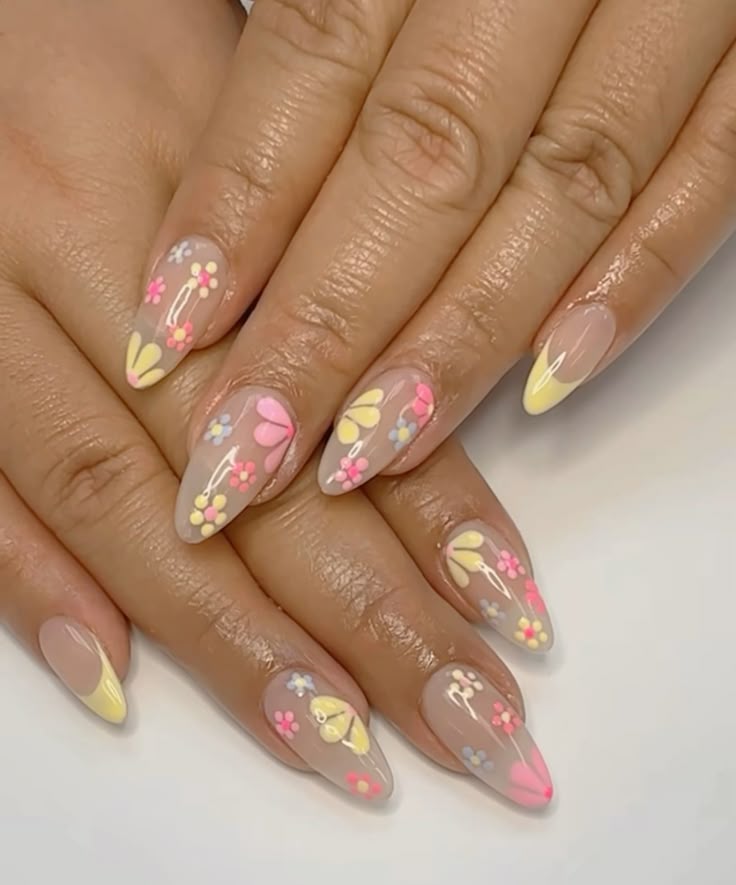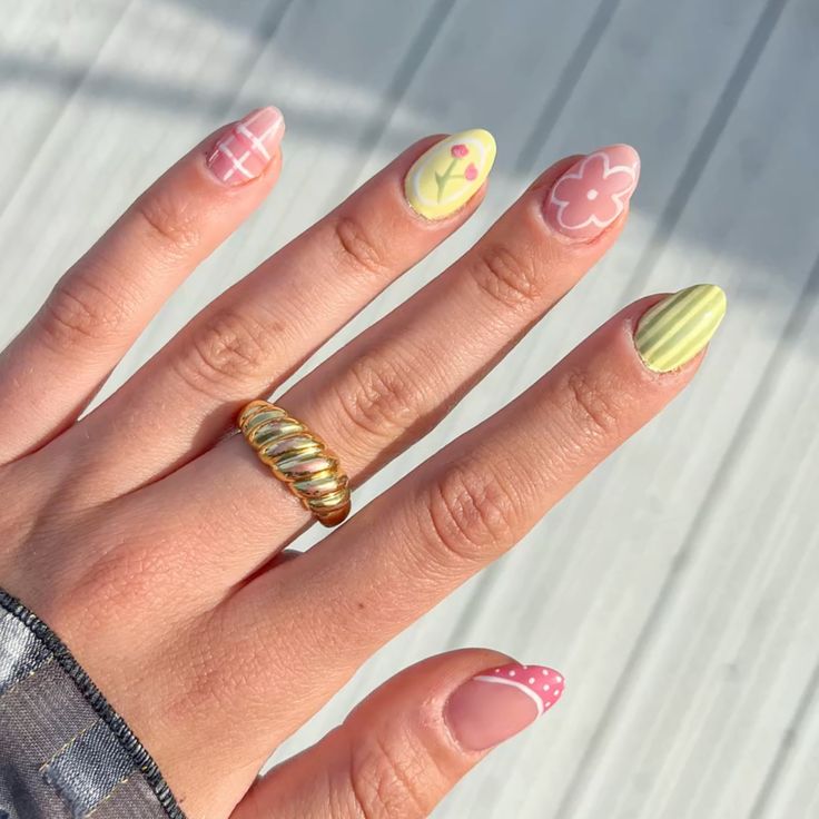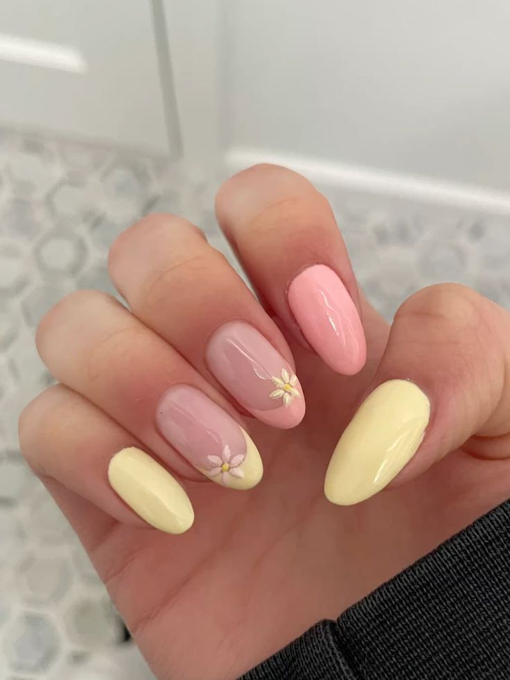 A mix of pink and yellow nails decorated with simple florals and light line details. The overall look is sweet, fresh, and inspired by blooming spring days.