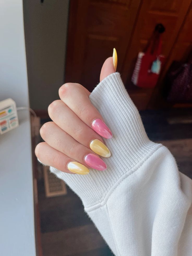 Pink and yellow alternate in a soft, glossy almond shape that feels sweet and airy. The look is simple yet eye-catching, giving off a cozy springtime warmth.