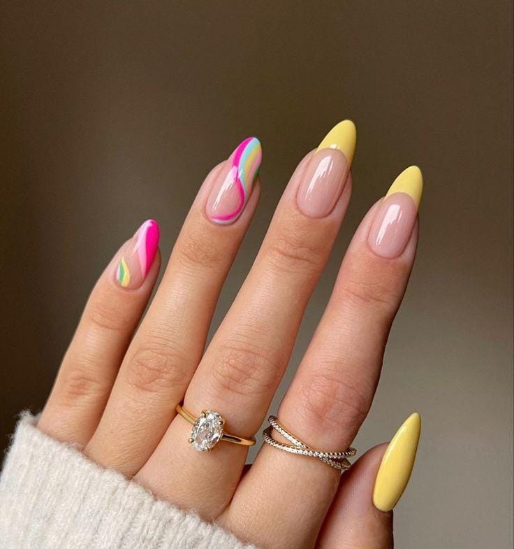 Swirled pink and yellow marble patterns create a dreamy, candy-like effect across the nails. The design feels modern and playful while still keeping a smooth, polished finish.