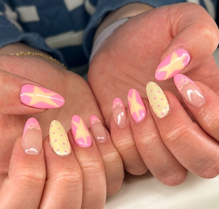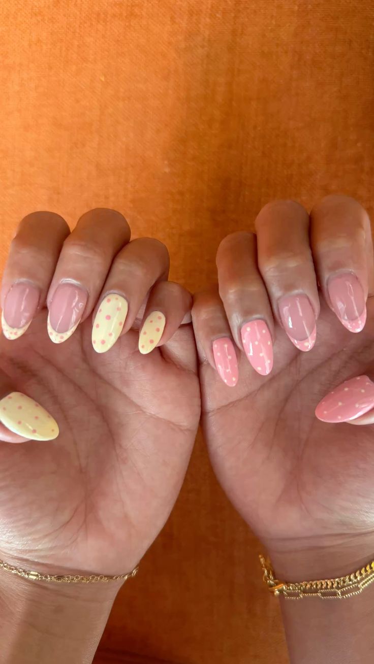 Almond-shaped nails alternate between pink and yellow with tiny polka dots and soft French tips. The design feels playful, balanced, and subtly retro.
