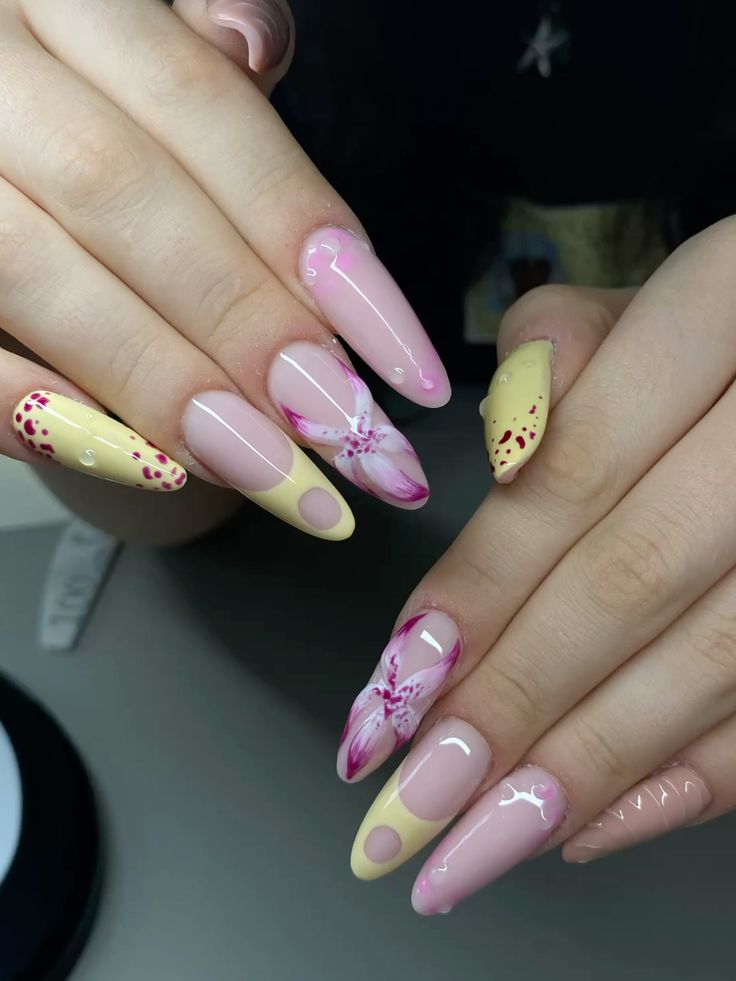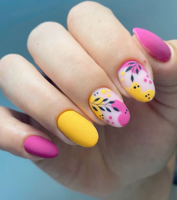 Vibrant pink and yellow nails are mixed with abstract floral and leaf designs for a lively finish. The overall look is artistic, upbeat, and full of spring energy.