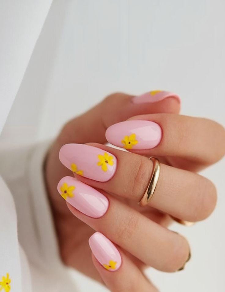 Classic pink and yellow shades get a spring upgrade with tiny floral details and bold accent nails. The overall vibe is sweet, polished, and cheerful without feeling overdone.