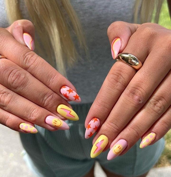 Pink and yellow nails are mixed with smiley faces, lightning bolts, and star accents. This design feels bold, playful, and full of personality, perfect for a fun spring statement.