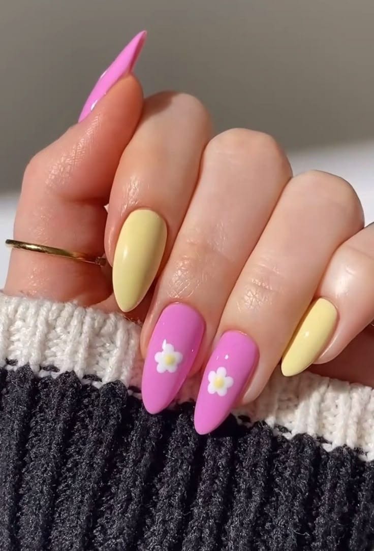 Alternating pink and yellow nails are paired with bold white daisy accents for a fun, standout look. The design feels bright, youthful, and perfect for a sunny spring statement.