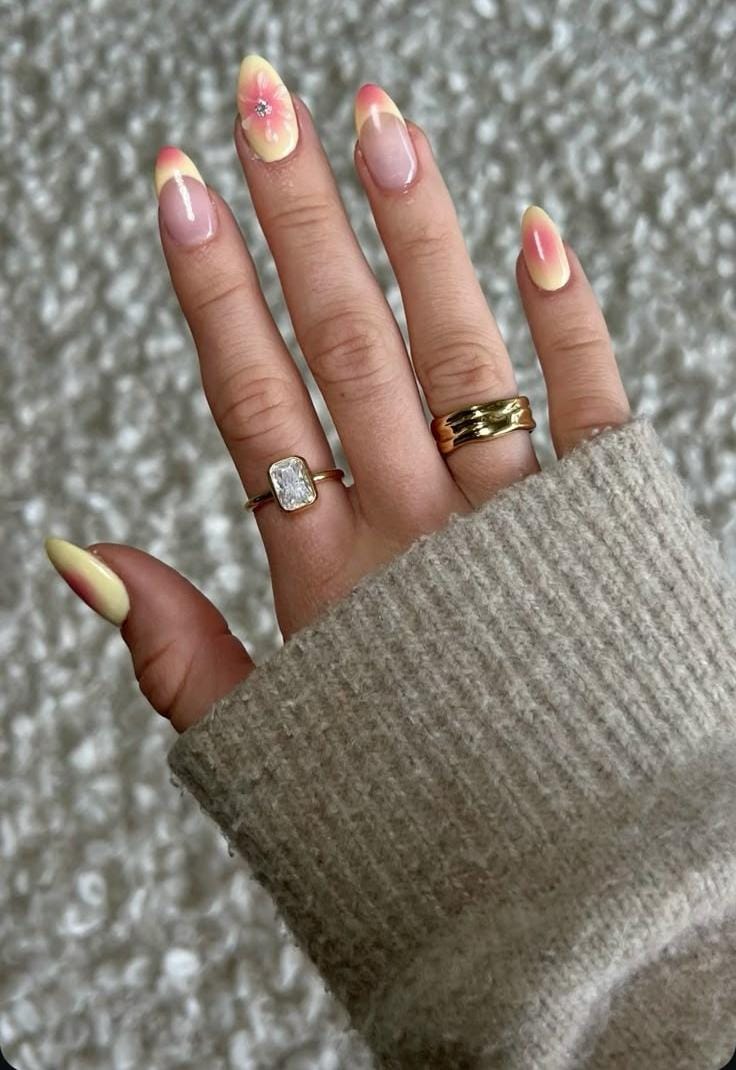 A soft pink and yellow French tip design with a subtle ombré effect and delicate floral accents. The overall look feels airy, feminine, and effortlessly chic.