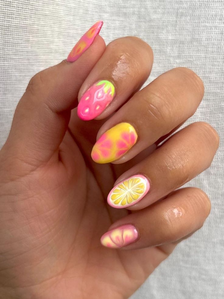 This design mixes hot pink and bright yellow with playful floral accents for a bold spring look. The vibe is cheerful, energetic, and perfect for making a statement.