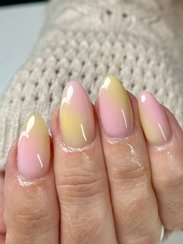 This design features a smooth pink-to-yellow ombre that blends seamlessly for a fresh, airy look. The glossy almond shape gives it a soft spring sunrise vibe that feels elegant and effortless.