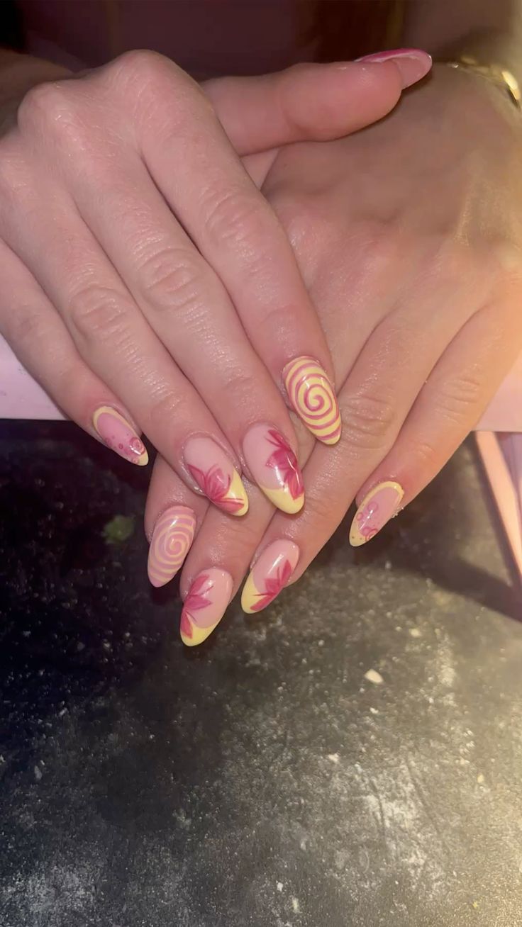 Pink and yellow tones mix with hand-painted florals and swirl accents for a fun, artistic feel. The look is cheerful and whimsical, perfect for a bold but still feminine spring manicure.