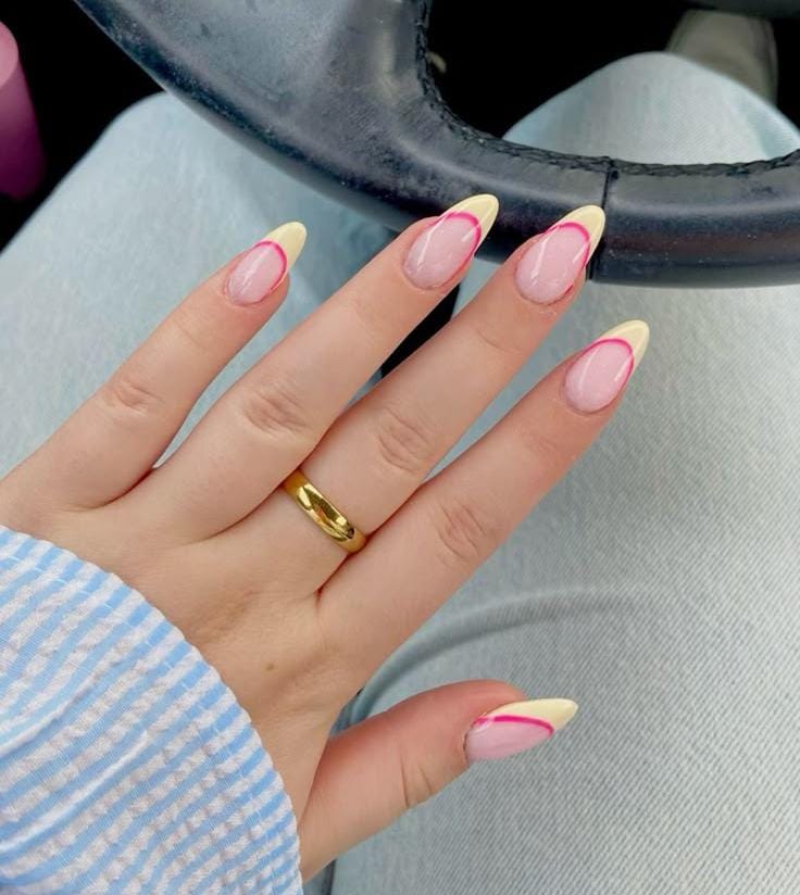A fresh take on the French manicure with pale yellow tips outlined by soft pink accents. The look is minimal yet bright, giving a clean and sunny springtime feel.