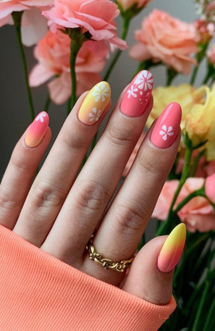 A soft pink-to-yellow ombré creates a warm spring base, finished with simple white floral accents. The look feels fresh, cheerful, and effortlessly pretty.