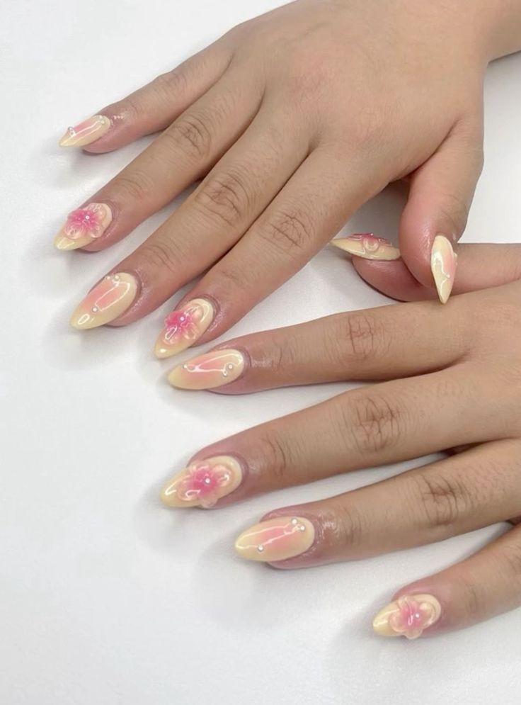 A gentle pink base fades into yellow tips, finished with tiny floral details. This design feels light, airy, and inspired by spring sunsets.