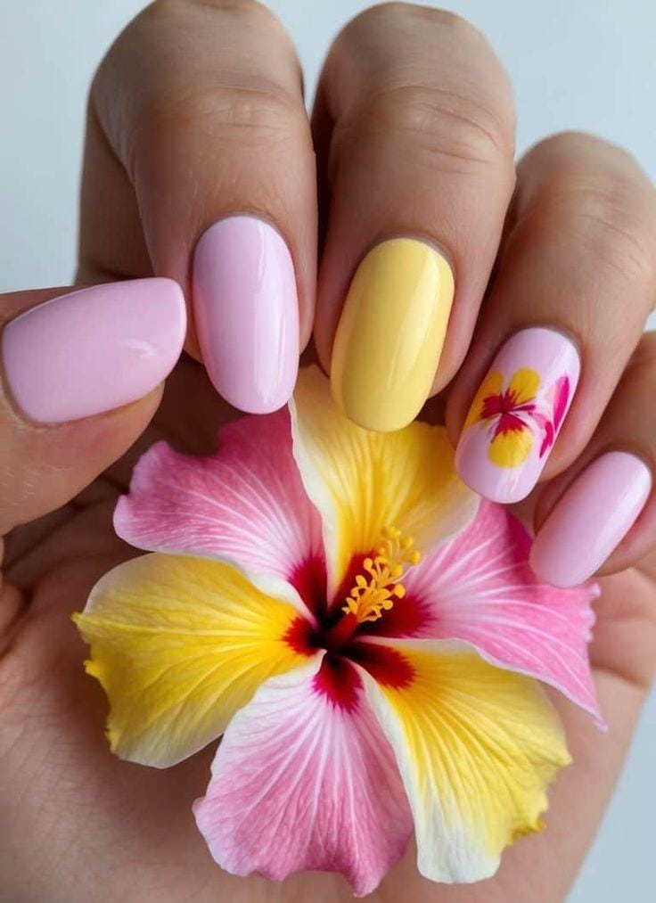 Blush pink and sunny yellow nails are paired with a floral accent that feels inspired by tropical blooms. The overall look is soft, glossy, and warm with a vacation-ready vibe.