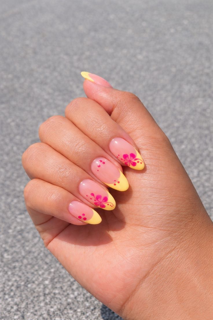 Bright pink and yellow French tips are combined with small floral accents on a nude-pink base. The style is cheerful and eye-catching while still feeling clean and polished.