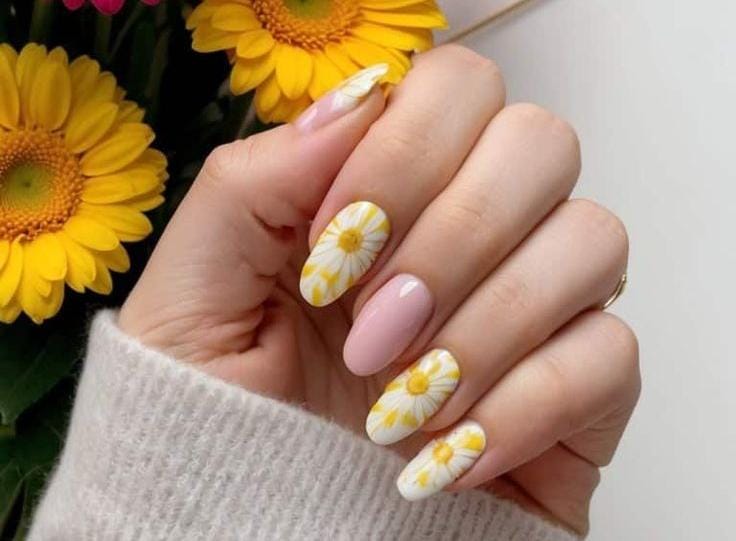 Soft pink nails are paired with delicate white and yellow daisy designs. The look is fresh, floral, and perfectly captures a calm, sunny spring vibe.