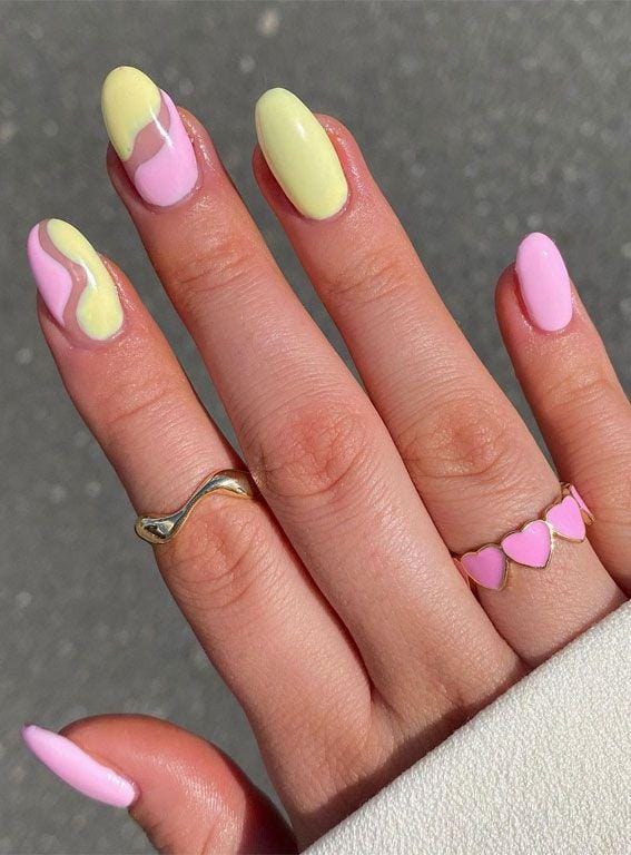A mix of solid pinks and yellows with soft, flowing swirl accents creates a fun yet polished look. The design feels modern, cheerful, and effortlessly stylish.