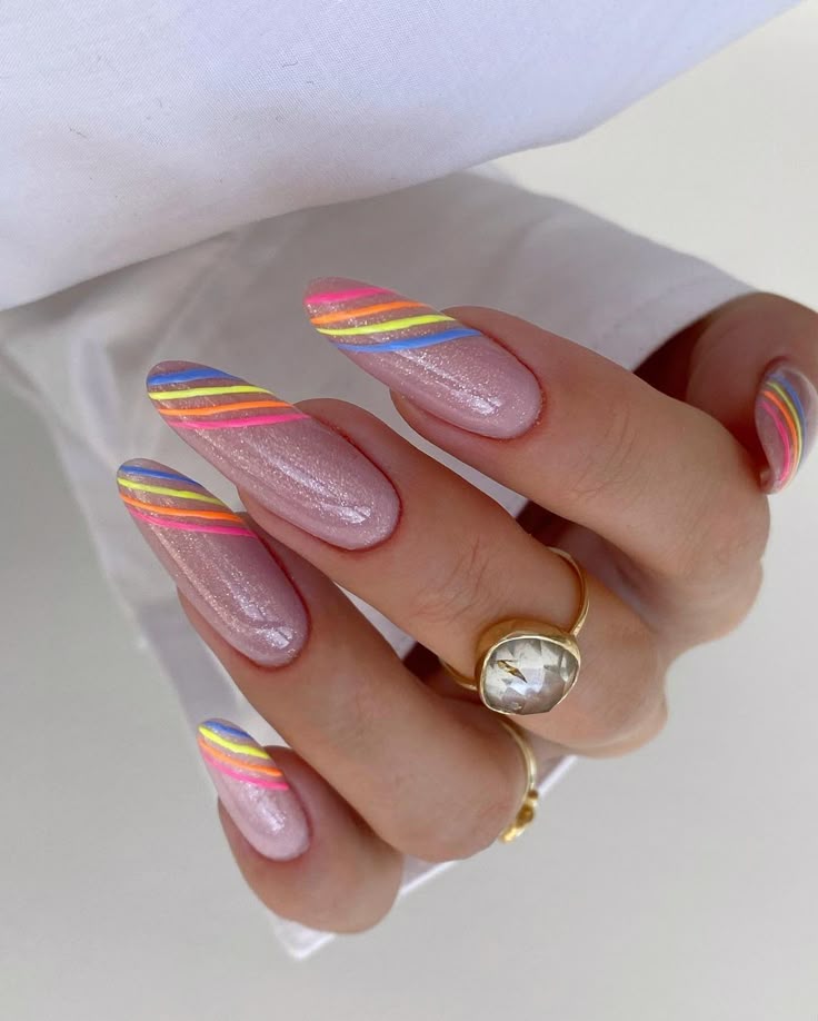 A soft pink shimmer base is paired with thin rainbow stripes that add a colorful twist. The design feels fun, modern, and subtly eye-catching.