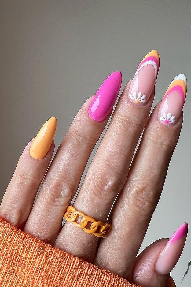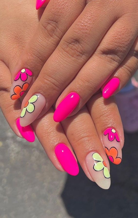 Hot pink nails are mixed with soft nude bases and bold, colorful flower art in pink, orange, and yellow. The overall vibe is fun, retro-inspired, and full of summer personality.