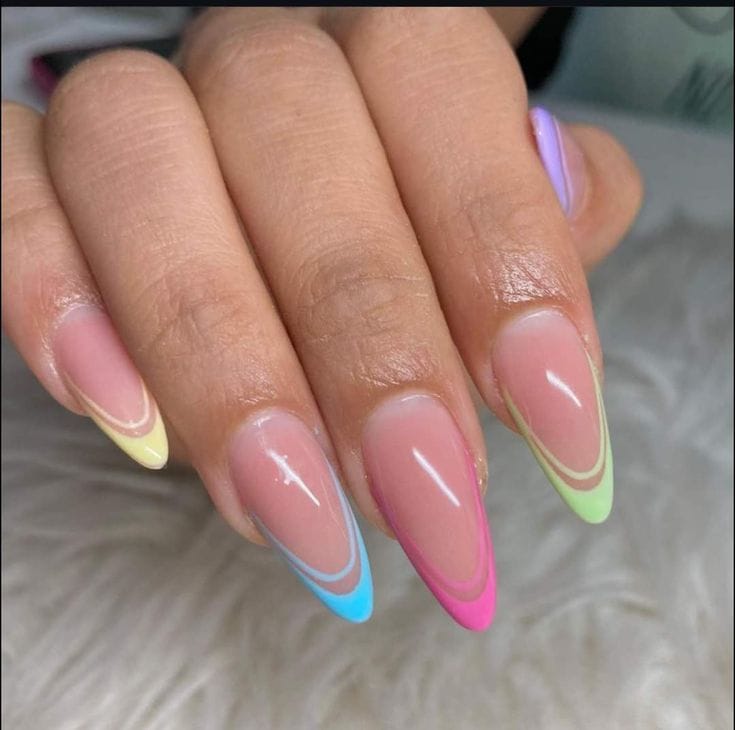 A modern French tip style blends soft pink and pale yellow over a nude base. The look is clean, minimal, and effortlessly summery.
