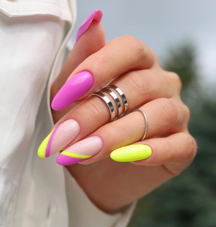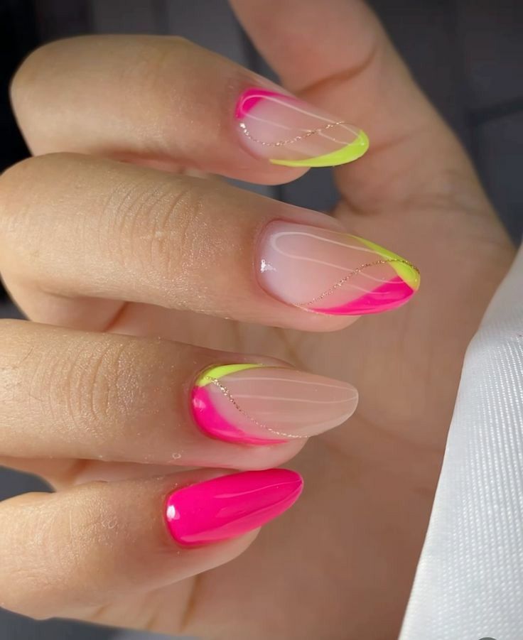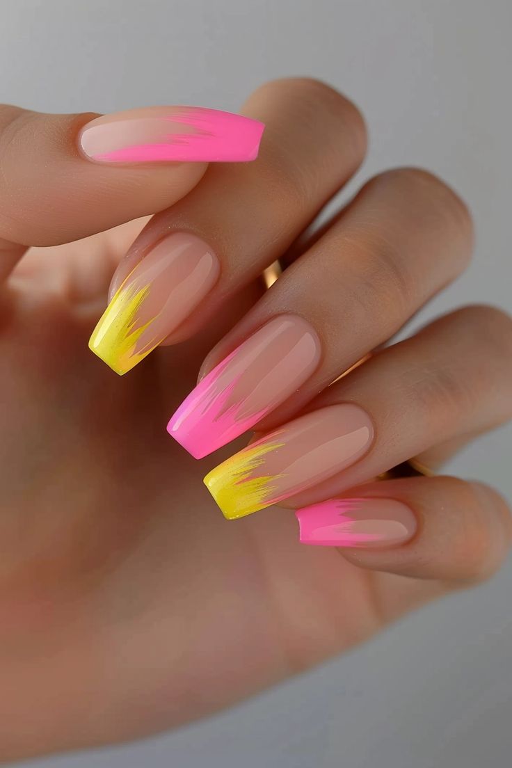 This design features a sheer nude base with hot pink and neon yellow curved tips that feel playful and modern. The look is fresh, glossy, and perfect for a bold summer vibe.