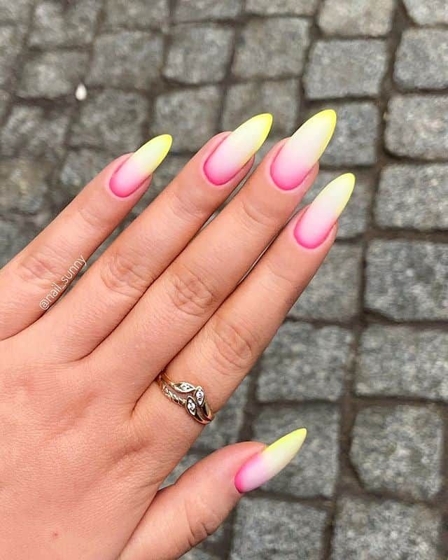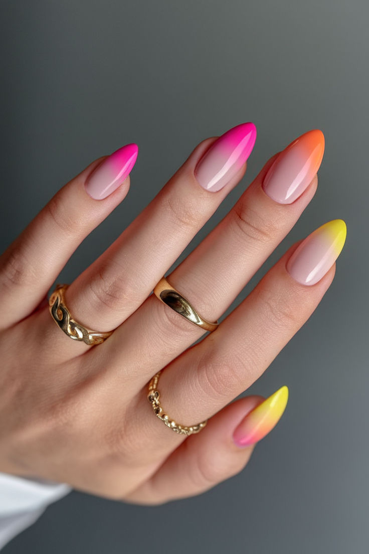 These nails feature a soft nude base with bright pink and yellow ombre tips that blend smoothly for a warm, summery look. The overall vibe is clean, modern, and effortlessly chic