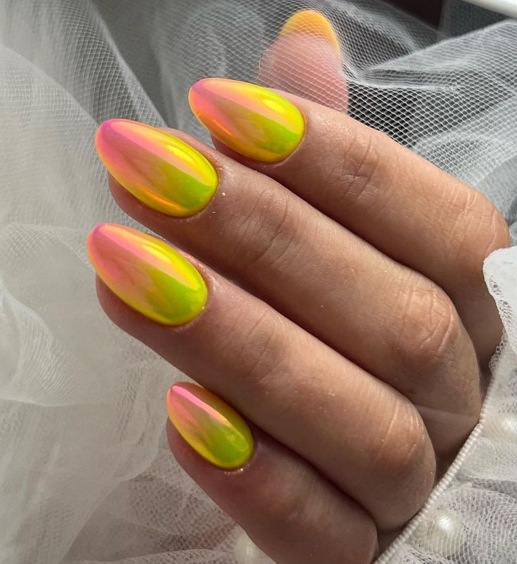 Pink and yellow melt together under a glossy, chrome-like finish that reflects light beautifully. This design has a bold, futuristic summer glow with a beach-party feel.