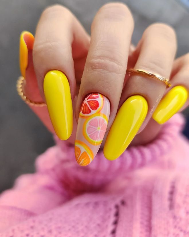 Glossy yellow nails are mixed with a citrus slice accent nail in soft pinks and oranges for a fresh, juicy feel. This design looks cheerful, vibrant, and full of summer energy.