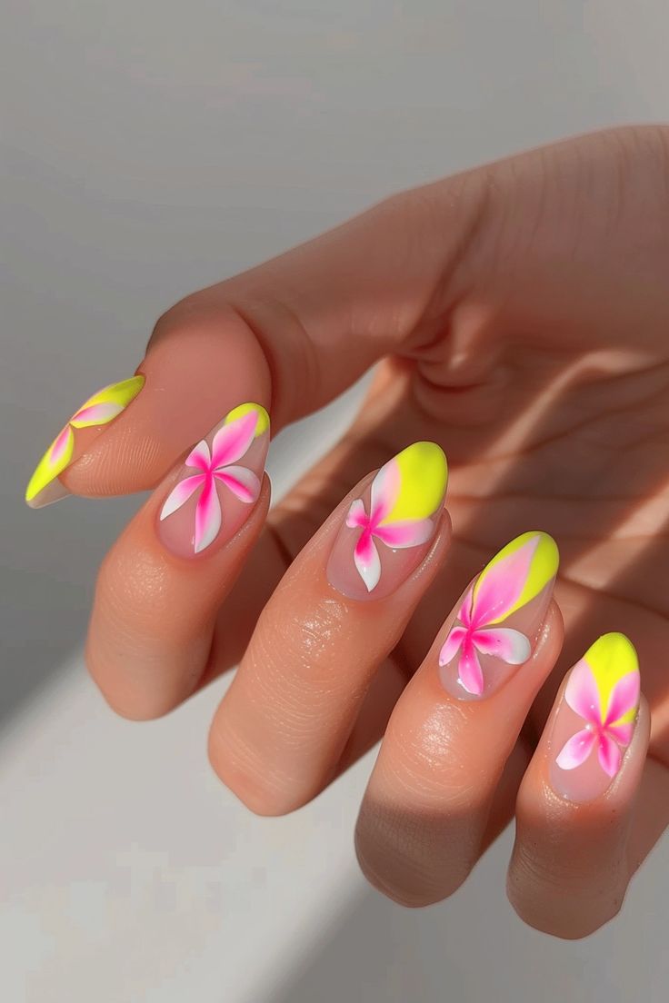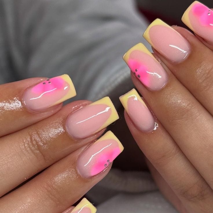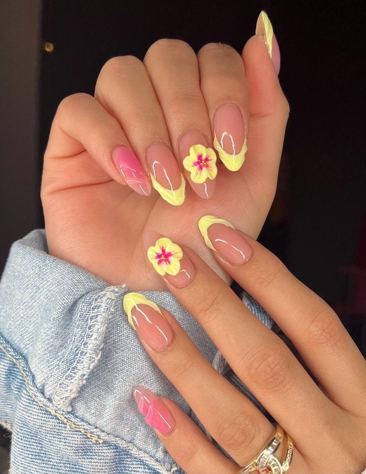 These nails feature a soft nude base with neon yellow tips and bright pink floral accents for a fresh, tropical feel. The overall vibe is playful, summery, and light without feeling too busy.