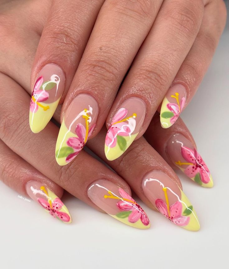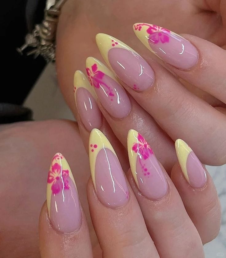 These nails combine a milky pink base with soft yellow tips and delicate pink floral details. The design feels elegant yet playful, with a tropical summer touch