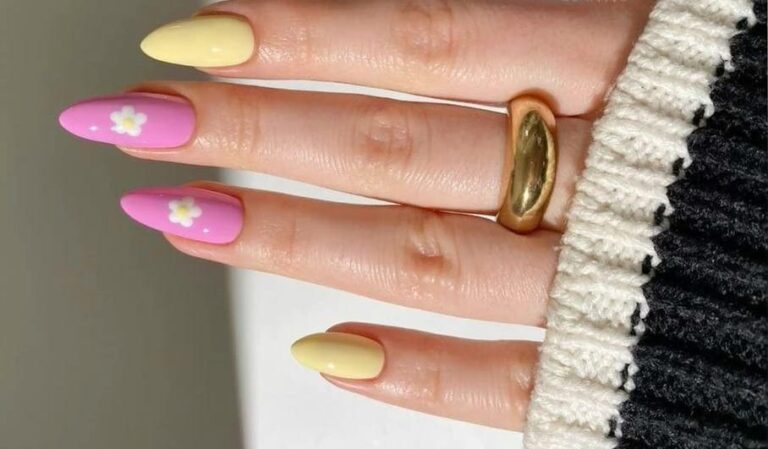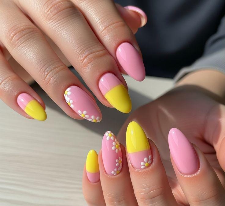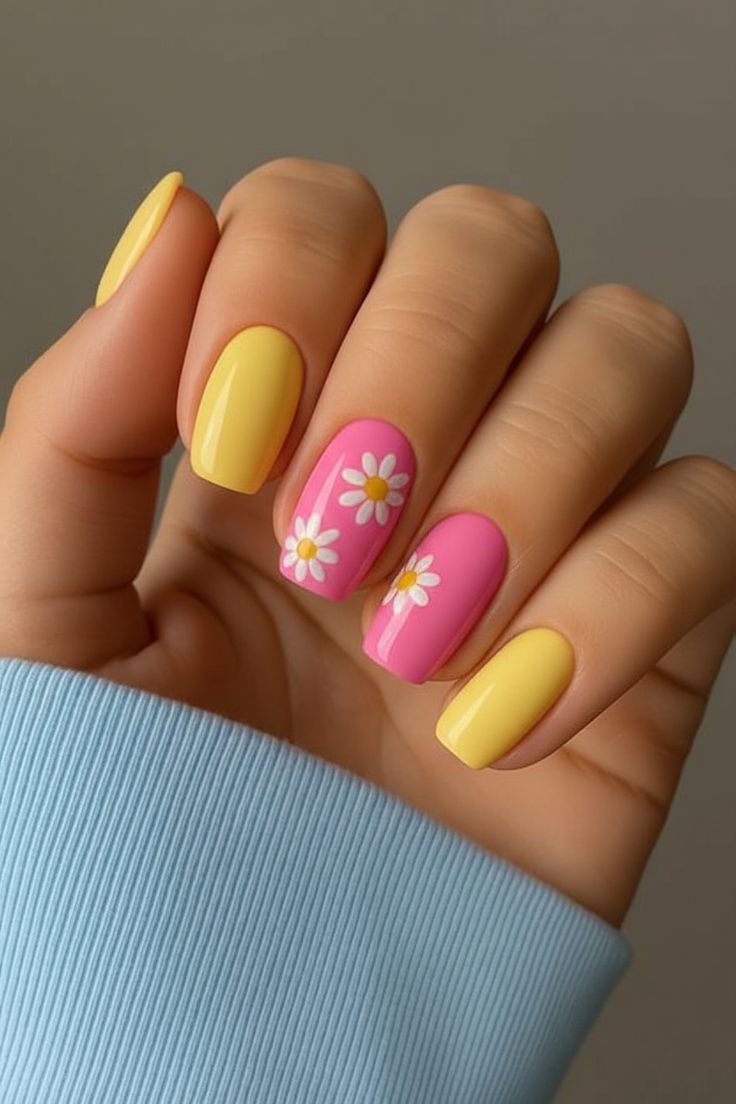 Pink and yellow are split across the nails with small white daisy accents adding charm. The look is cheerful, youthful, and full of sunny summer energy.