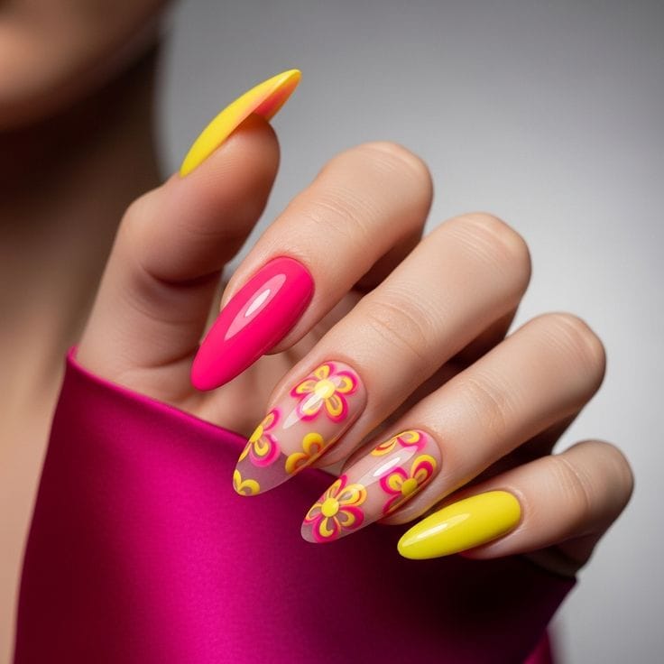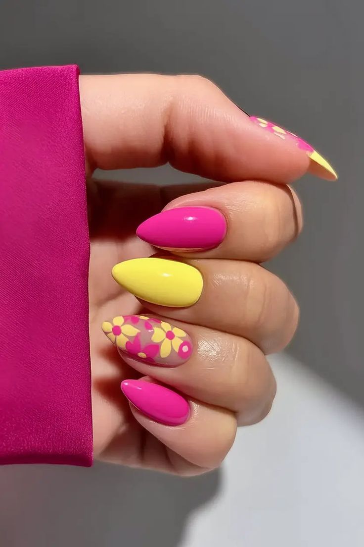 Bold hot pink and sunny yellow nails are mixed with a sheer floral accent for a fun, eye-catching look. The design feels energetic, cheerful, and perfect for vibrant summer outfits.