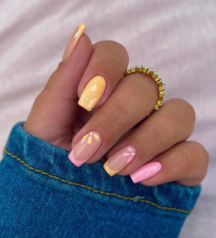This design blends sheer pink bases with soft yellow tips and tiny floral accents for a light, airy look. The overall vibe feels delicate, fresh, and perfect for warm summer days.
