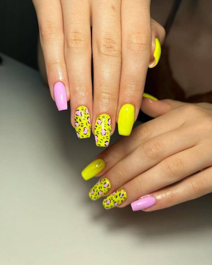 This design mixes bright neon yellow and soft pink with playful leopard-print accents for a bold summer look. The vibe is fun, edgy, and perfect for standing out.