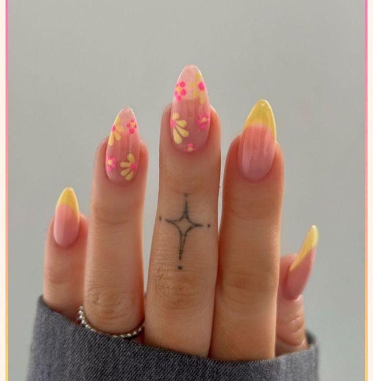 Soft pink and buttery yellow come together in a modern French tip style with delicate floral details. It feels fresh, feminine, and effortlessly summery.