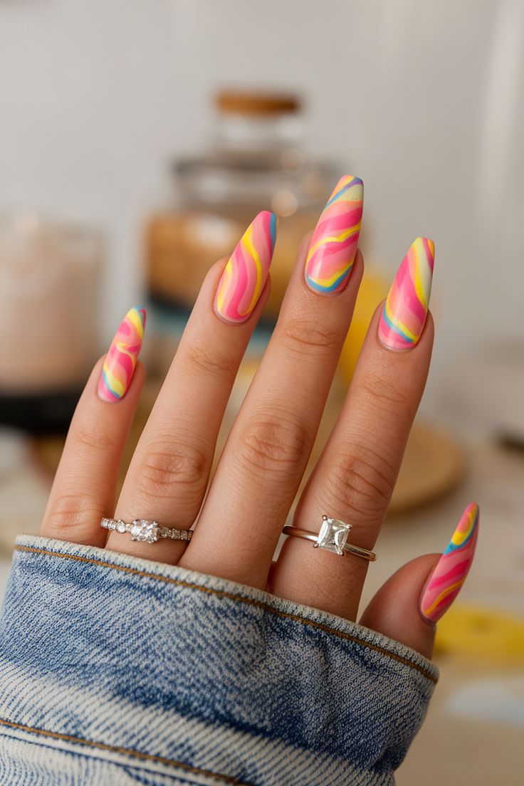 This design mixes soft pink bases with sunny yellow tips and playful pastel swirls. The overall look feels fresh, cheerful, and perfect for a light summer vibe.