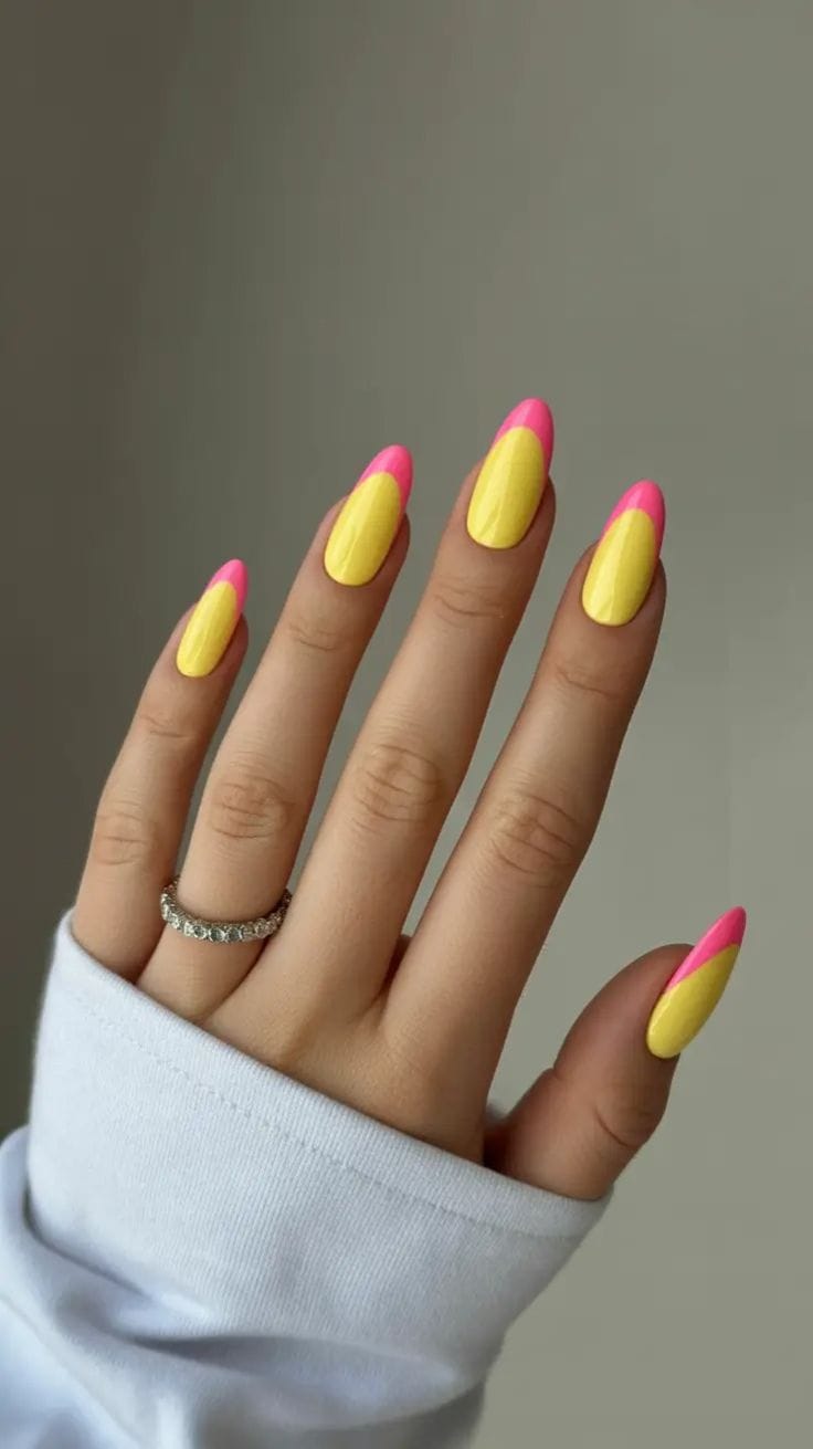 Vibrant yellow nails are topped with sharp pink accents for a striking color-block effect. The style is simple, confident, and perfect for a bold summer statement.