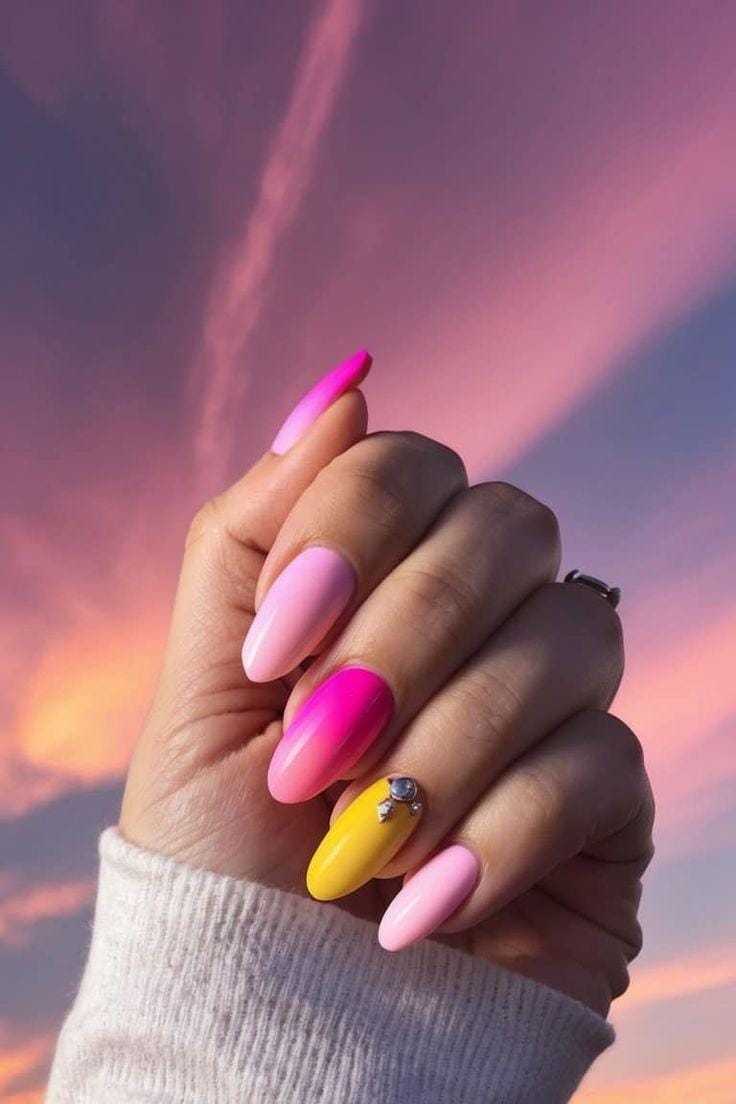 Soft pinks blend into sunny yellow with a smooth ombré effect, finished with a subtle accent nail detail. This design feels warm, dreamy, and effortlessly summery.