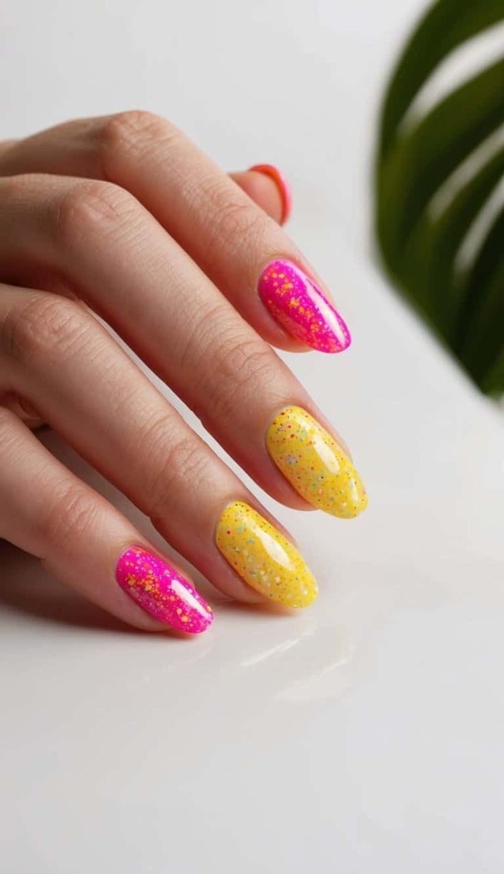 Pink and yellow nails are topped with fine glitter speckles for a playful, candy-like finish. The look is cheerful, fun, and full of summer sparkle.