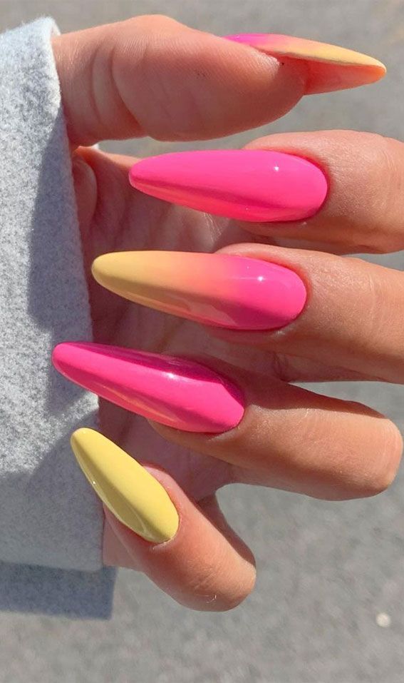 Vibrant pink and creamy yellow blend seamlessly in a glossy ombré on long, sleek nails. The design feels bold yet smooth, like a bright summer sorbet.