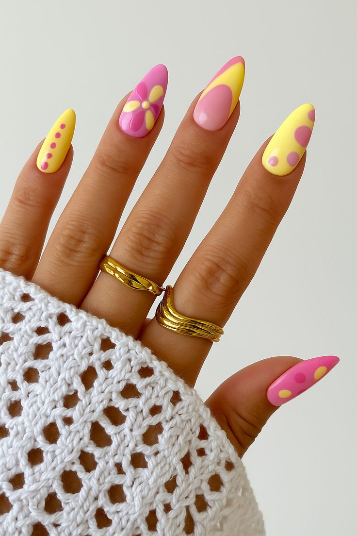 Soft pink and buttery yellow nails mix playful dots and retro floral accents for a cheerful, summery look. The overall vibe feels fun, youthful, and effortlessly cute.