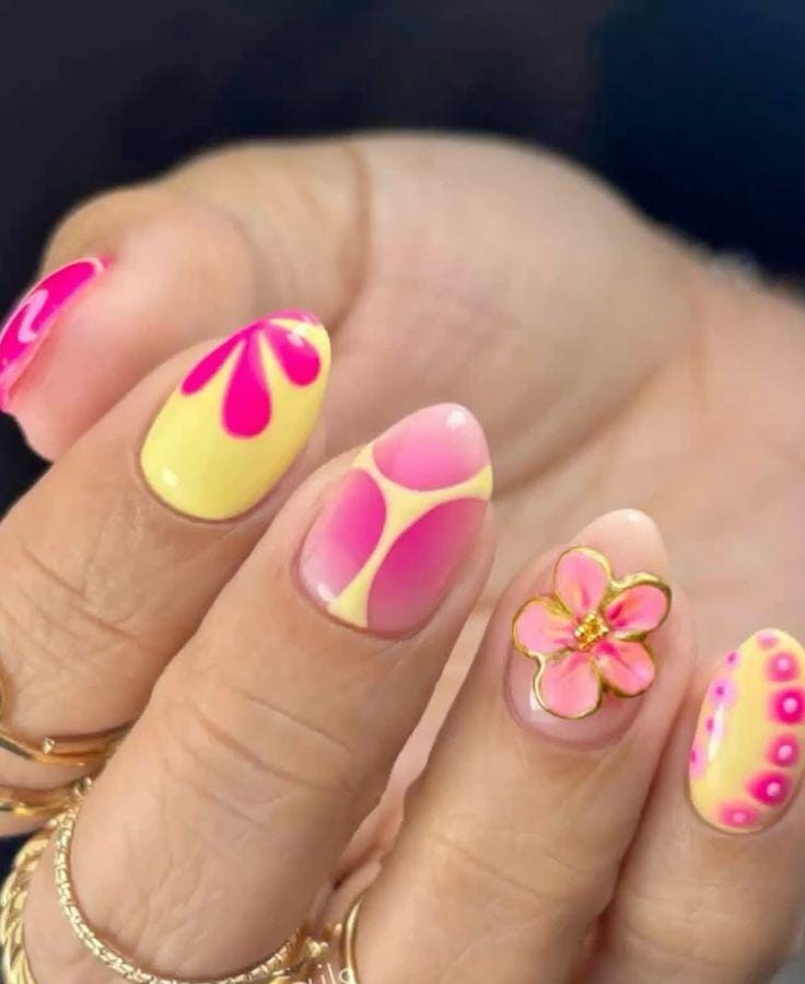 Bright pink and warm yellow shades are paired with full floral patterns for a lively, statement manicure. The design feels bold, happy, and perfect for peak summer days.