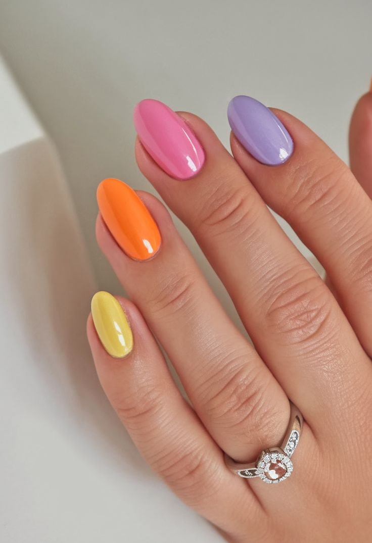 Each nail is painted a different soft summer shade, including pink, yellow, orange, and lavender, with a glossy finish. The vibe is simple, fresh, and perfect for an easy seasonal look.
